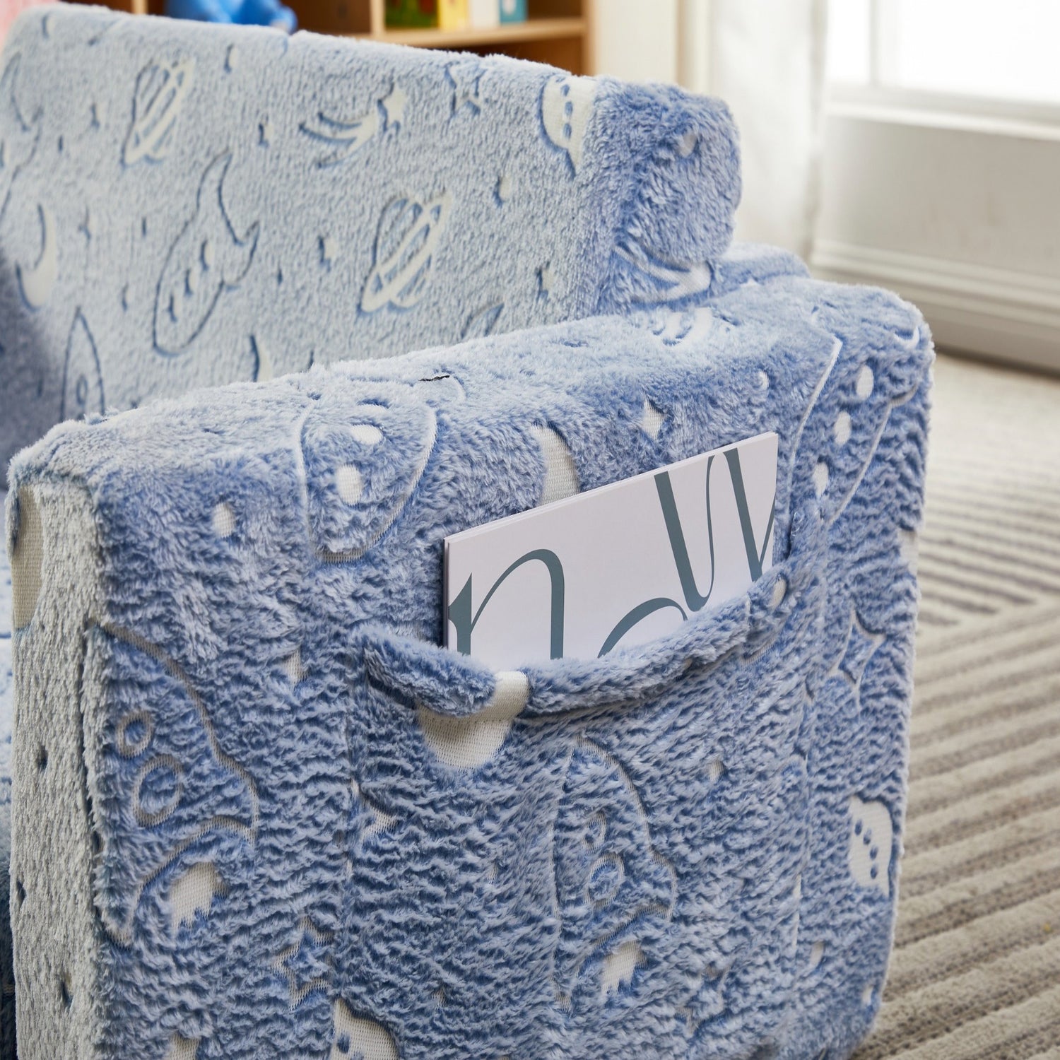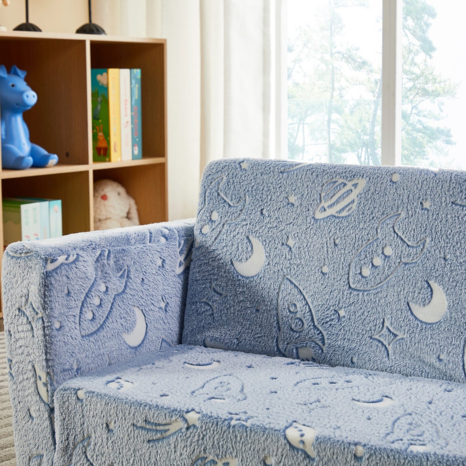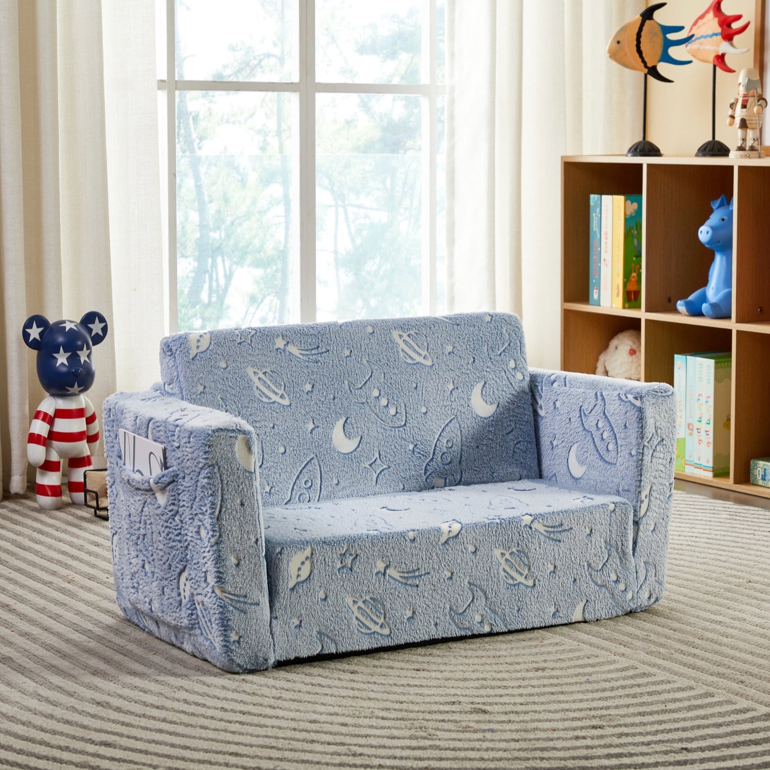 The Space Explorer Glow Flip-Out Double Couch brings the wonder of outer space directly into your child's bedroom or playroom. This innovative kids flip-out couch features enchanting astronauts, rockets, and planets that magically glow in the dark, creating an immersive space exploration experience that sparks imagination during both day and night play.