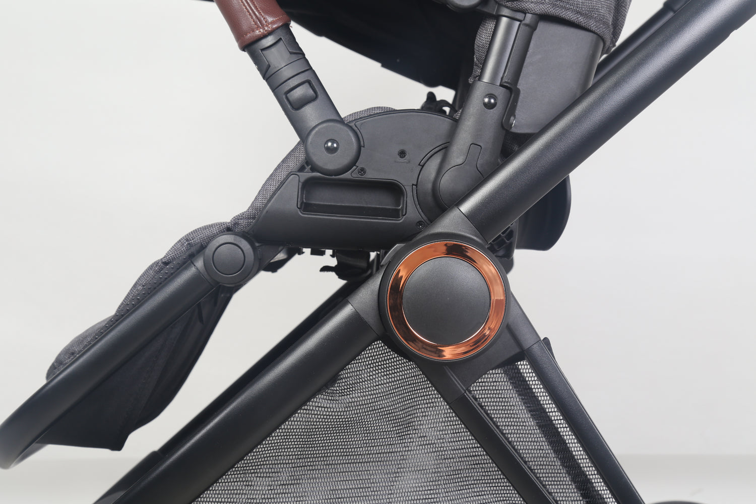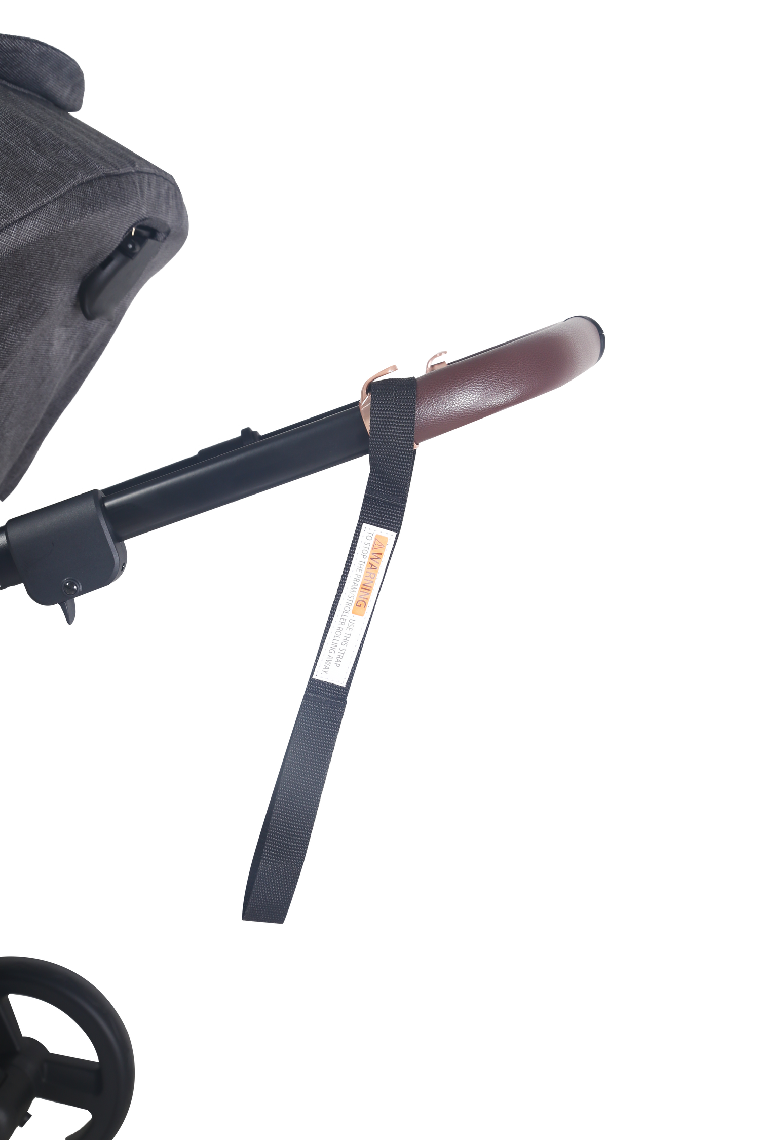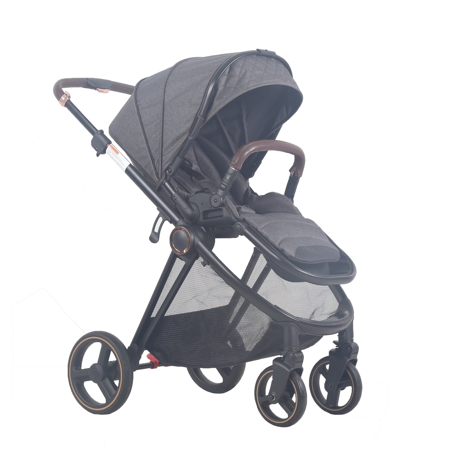 Pram handle is coved with brown leather to give you more comfort, it also can be also adjusted with one hand, and it’s has multiple height.