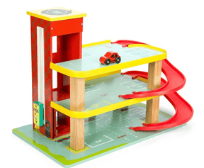 An award-winning wooden garage, by Le Toy Van, featuring three storeys, spiral ramps, petrol pump, car and working lift. Customise your garage with a set of fun stickers in English, French, German and Spanish.