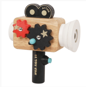 Children can create their own pretend Hollywood blockbuster with this wooden film camera. Designed with spinning cogs and a kaleidoscope lens it offers an opportunity for creative and social play.