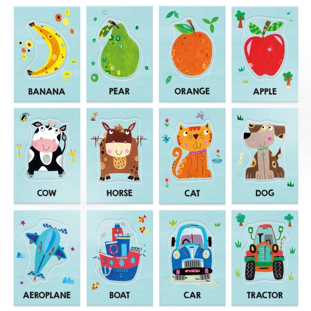 A series of flashcards for encouraging babies to listen to words and practice pronouncing them. Individual teaching shapes slot into place on each card. These cards invoke the Montessori three-period, or three-step, learning method. This method helps children learn vocabulary and concepts by