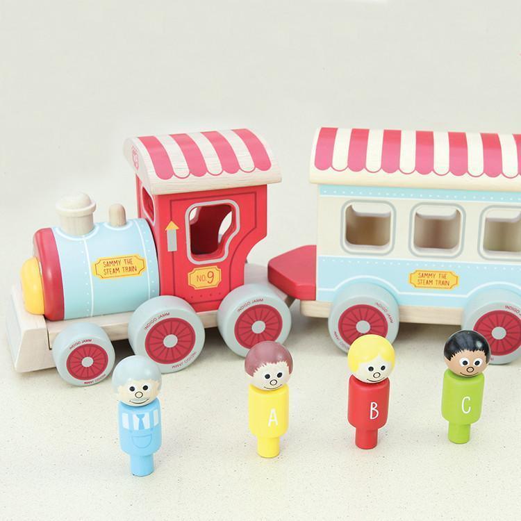This retro style classic is sure to become a favourite family heirloom. Sammy features a pull along train engine and detachable passenger carriage. Includes three peg people passengers and a train driver.